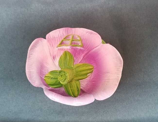 Very detailed green leaves make up the walls. The roof is a large purple bell-shaped flower with a leafy green top. A tiny brown door with a 'Welcome' sign invites your tiny guests to stay a while.